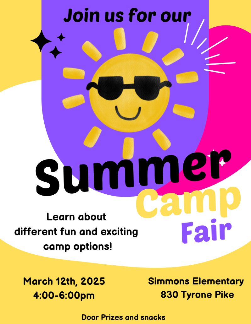 The annual Summer Camp Fair is Wednesday, March 12, from 4:00 - 6:00 PM at Simmons Elementary. Come learn about different fun and exciting camp options for kids ages 6 - 15! There will be door prizes and snacks for participants to enjoy.
