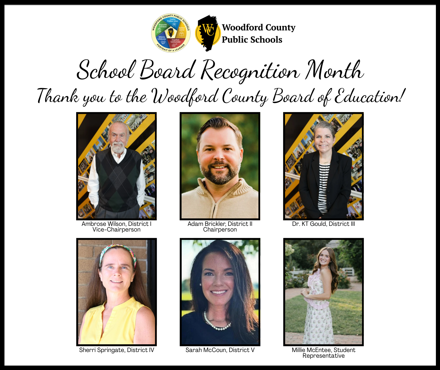 • January is School Board Recognition Month. Thank you to the members of the Woodford County Board of Education for their time, effort, and passion! We so appreciate their desire to serve the children, families, and staff members of Woodford County Public Schools!
