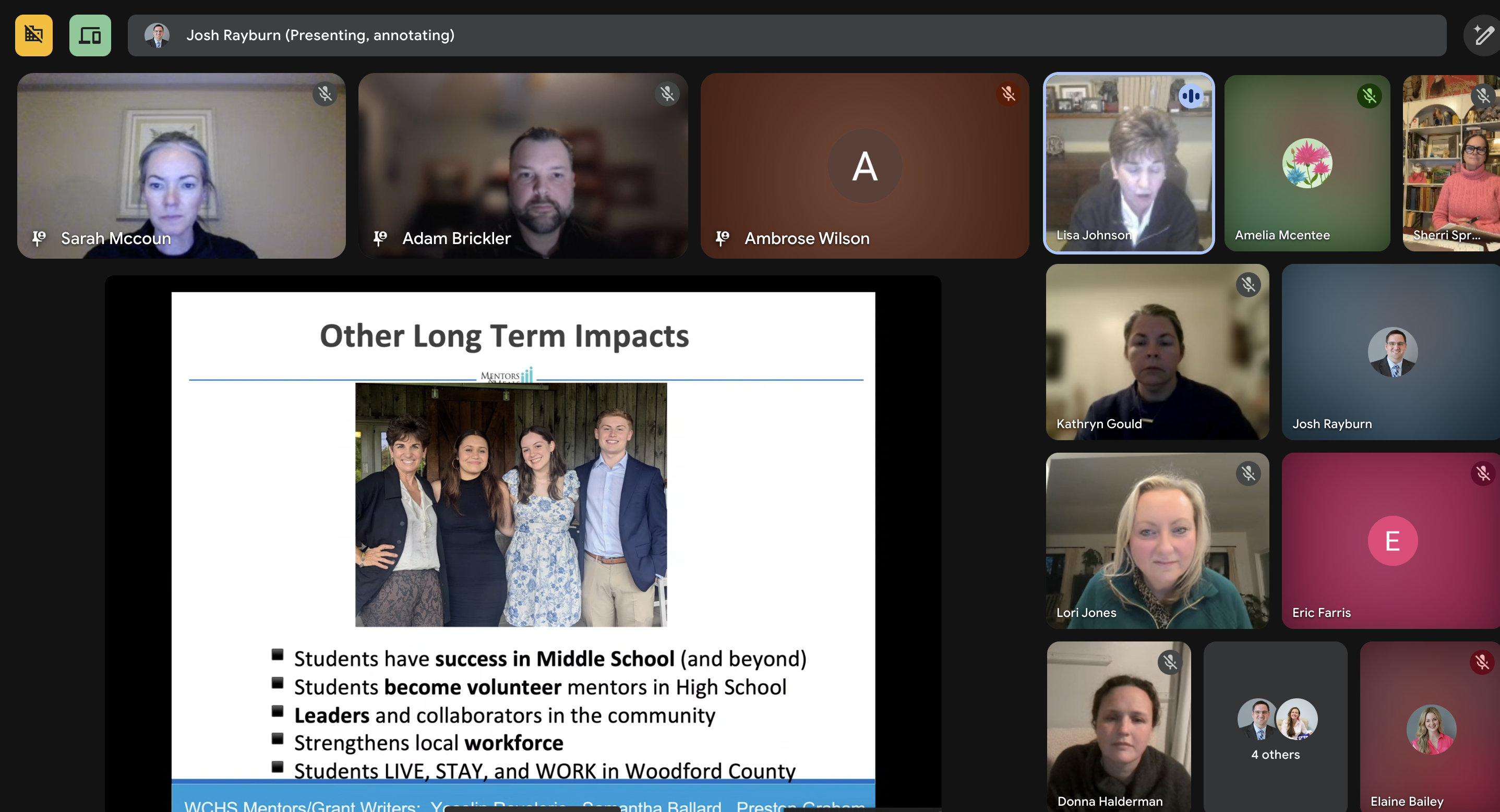• Mentors & Meals Presentation: Lisa Johnson and McKenna Halderman presented on the Mentors & Meals middle school program in Woodford County. Mentors & Meals is a program that provides mentorship, friendship, homework help, and a meal to middle school students in the after-school hours. By giving students a place to connect with their peers and with high school and college mentors, middle school participants thrive! Click here to view the presentation with data, photos, and more information.