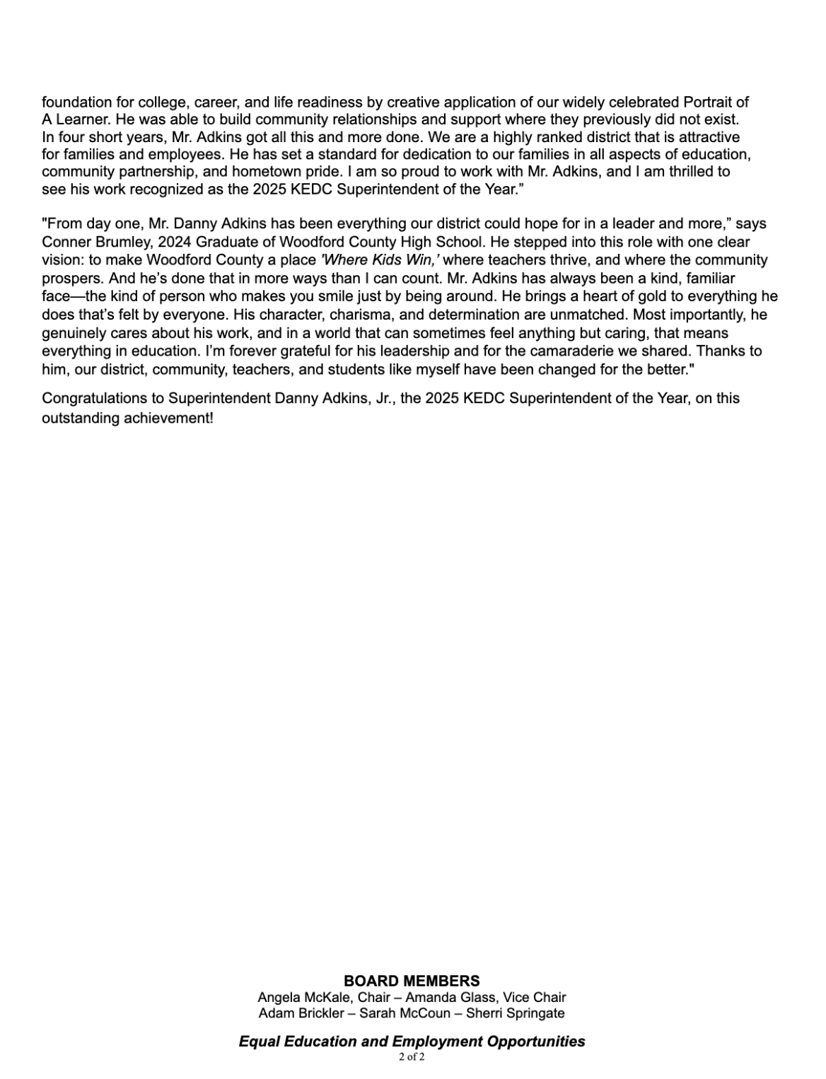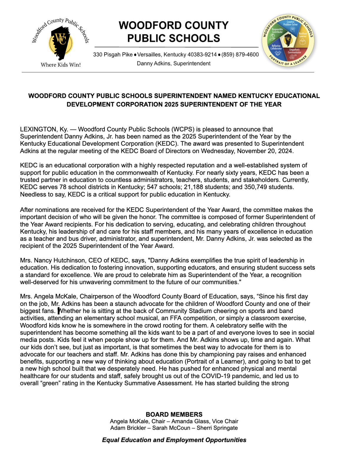 ⭐️ WOODFORD COUNTY PUBLIC SCHOOLS SUPERINTENDENT NAMED KENTUCKY EDUCATIONAL DEVELOPMENT CORPORATION 2025 SUPERINTENDENT OF THE YEAR ⭐️